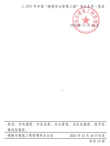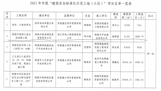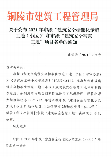 熱烈祝賀我司承建的銅陵市新城大道北延道路工程(項(xiàng)目經(jīng)理:儲(chǔ)昭勝)榮獲銅陵市2021年市級(jí)“建筑安全標(biāo)準(zhǔn)化示范工地(小區(qū))”。