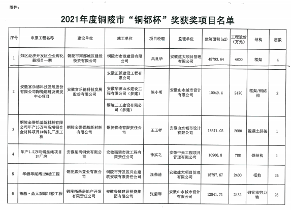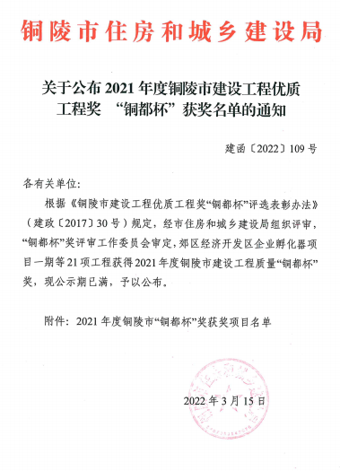 熱烈祝賀我司承建的郊區(qū)經(jīng)濟開發(fā)區(qū)企業(yè)孵化器項目一期(項目經(jīng)理:鳳良華)榮獲2021年銅陵市建設(shè)工程優(yōu)質(zhì)工程獎“銅都杯” 。
