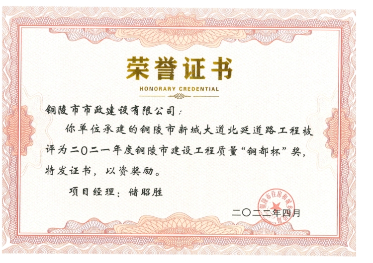 熱烈祝賀我司承建的銅陵市新城大道北延道路工程(項(xiàng)目經(jīng)理:儲(chǔ)昭勝)榮獲2021年銅陵市建設(shè)工程優(yōu)質(zhì)工程獎(jiǎng)“銅都杯”。