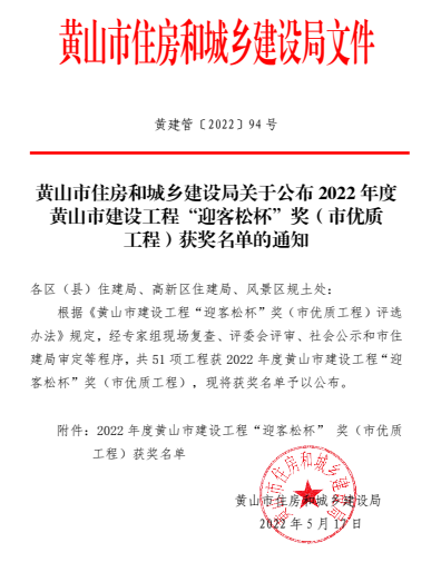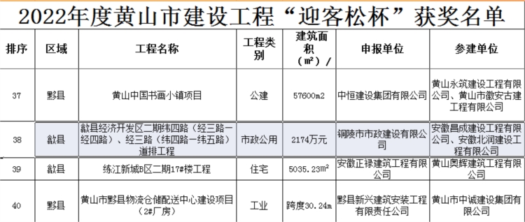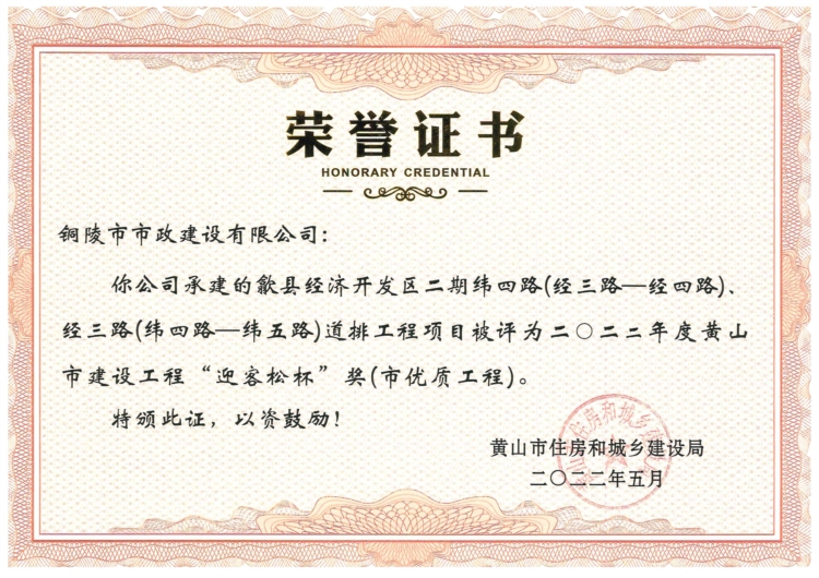 熱烈祝賀我司承建的歙縣經(jīng)濟開發(fā)區(qū)二期緯四路(經(jīng)三路—經(jīng)四路)、經(jīng)三路(緯四路—緯五路)道排工程(項目經(jīng)理:易曉云)榮獲2022年黃山市建設(shè)工程“迎客松杯” 獎。